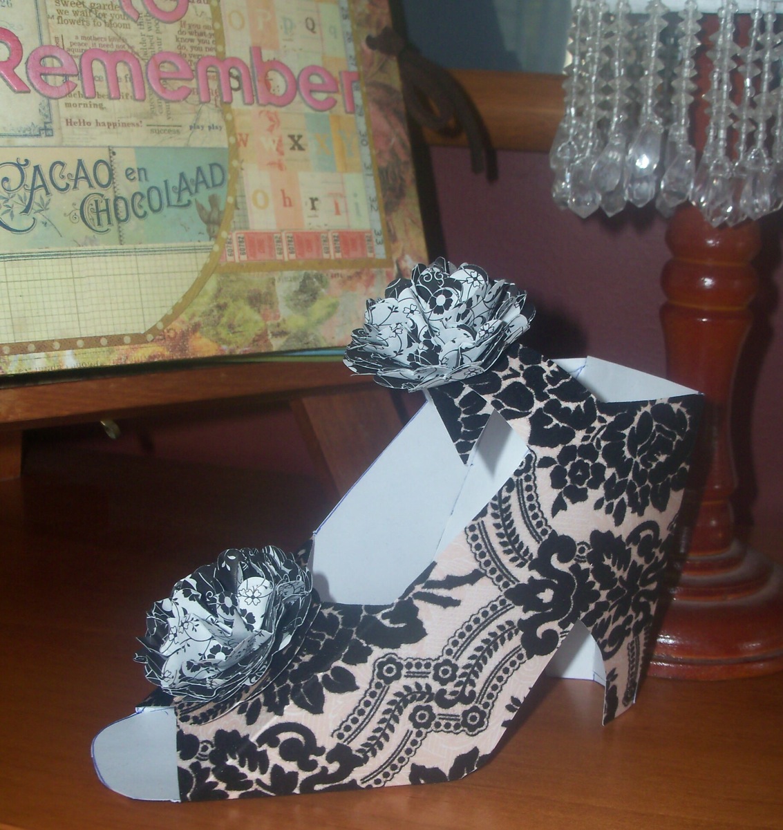 A friend of mine (Mandy) makes these wonderful shoes that she uses as a gift holder. Mandy creates these shoes using a transparency, so the receiver gets the full benefit of the shoe and the gift in side. I was lucky enough get a template from Mandy and decided to use a paper (creative Imaginations) that I have had for a number of years that I have struggled to bring myself to cut up just in case I could not do it justice. This is the result.